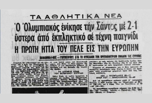 Ο Ολυμπιακός κερδίζει με 2-1 στο γήπεδο της Λεωφόρου Αλεξάνδρας (παρουσία 25000 φίλαθλων του) τη Σάντος, κορυφαία ομάδα του κόσμου. Διαμαρτυρίες προκαλεί η τιμή του εισιτηρίου που ορίστηκε στις 35 δραχμές, τιμή τριπλάσια των 10 δραχμών που κοστίζει ένα εισιτήριο την περίοδο αυτή. Στο 10ο λεπτό ο Ποσειδώνας το 1-0 από ασίστ του Σιδέρη. Στο 43ο ο Σουρούνης με σουτ από 25 μέτρα και το 2-0. Το γκολ για τη Σάντος από τον Ζίτο στο 50ο, με απευθείας εκτέλεση φάουλ και αφού η μπάλα αλλάζει πορεία από τον Στεφανάκο. Εκπληκτικές εμφανίσεις Σάββα Θεοδωρίδη και Κώστα Πολυχρονίου