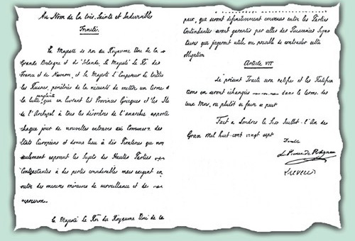 Στις 25 Απριλίου/7 Μαΐου θα υπογραφεί η Σύμβαση του Λονδίνου ανάμεσα στις μεγάλες δυνάμεις και τον εκπρόσωπο της Βαυαρίας, η οποία προβλέπει το μοναρχικό καθεστώς για την Ελλάδα και εκλέγει στο θρόνο τον Όθωνα. Με τη Σύμβαση αυτή η Ελλάδα γίνεται ανεξάρτητο κράτος και αναγνωρίζεται από τα άλλα κράτη.