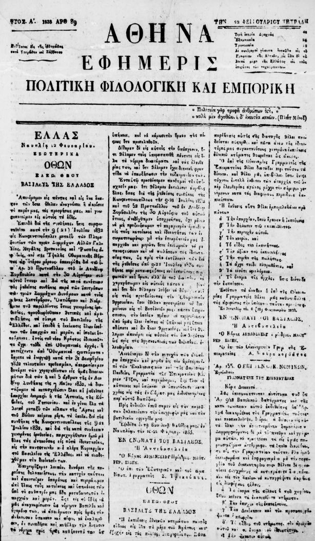 * η εφημερίδα συνεχίζει κανονικά την έκδοσή της μέχρι τον Ιούλιο του 1864, από το 1835 με έδρα την Αθήνα