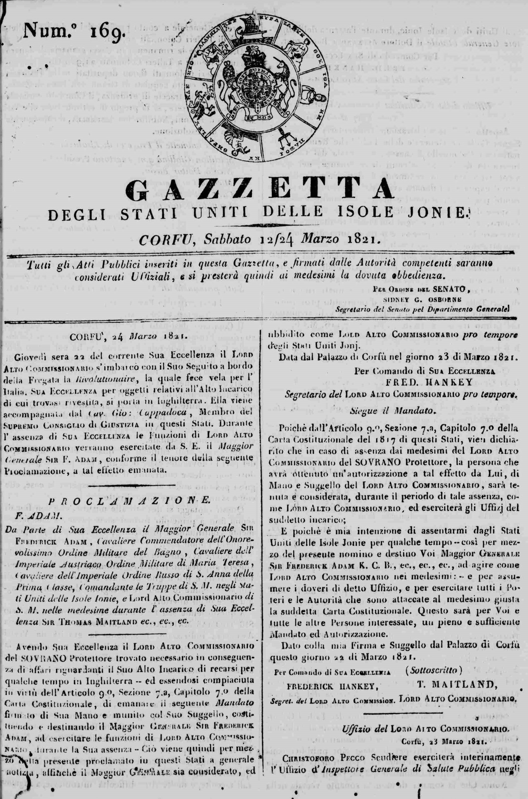 Ιδρυτής: Επίσημη εφημερίδα της Βρετανικής Διοίκησης που ξεκίνησε να κυκλοφορεί στη Ζάκυνθο το 1812